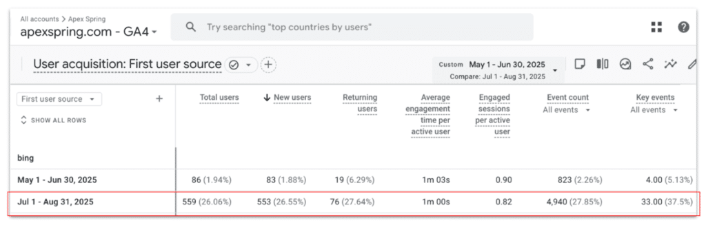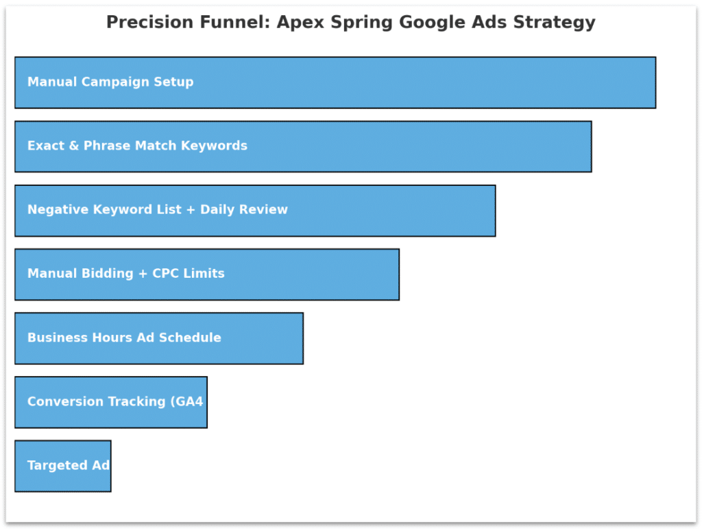 A manual, data-driven PPC strategy – aligned to Apex’s ideal customer profile – helped generate 52 high-intent leads in just 60 days while staying under budget. Google Ads captured high-intent searchers; Bing Ads expanded reach efficiently. Together, they shifted internal perceptions and proved paid search as a scalable lead gen channel for Apex Spring.