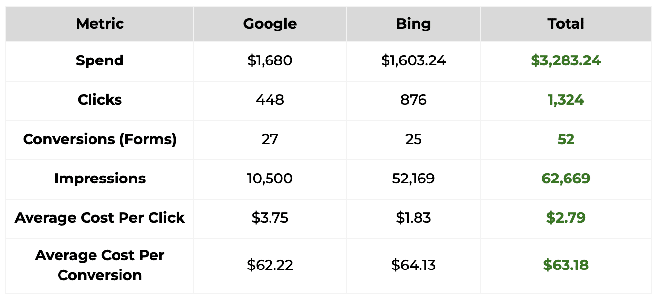 - Bing impressions increased 40% MoM, while reducing spend by 21% and improving lead volume