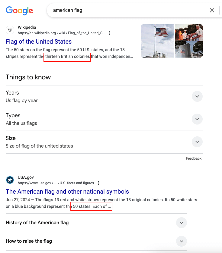 Each page on your website should have 1-2 target keywords and a cluster of halo keywords, which are related or long-tail keywords. For example, say you search for the American flag — Google is going to pull results that talk about the 50 states, the stripes, the colonies, etc etc.